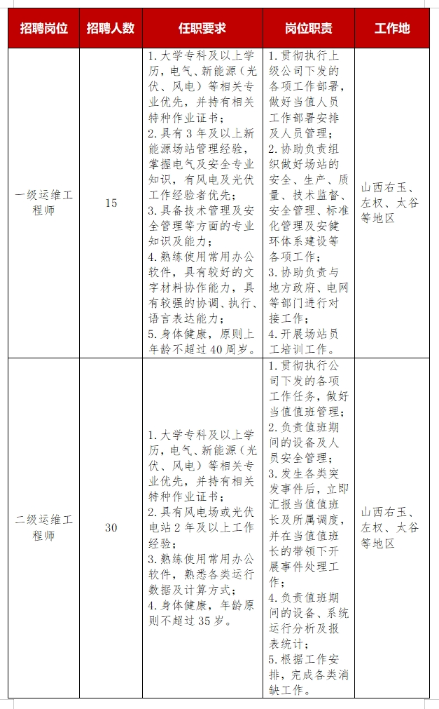 山西晉鑫仁和人力資源管理有限公司2025年新能源運維工程師招聘公告